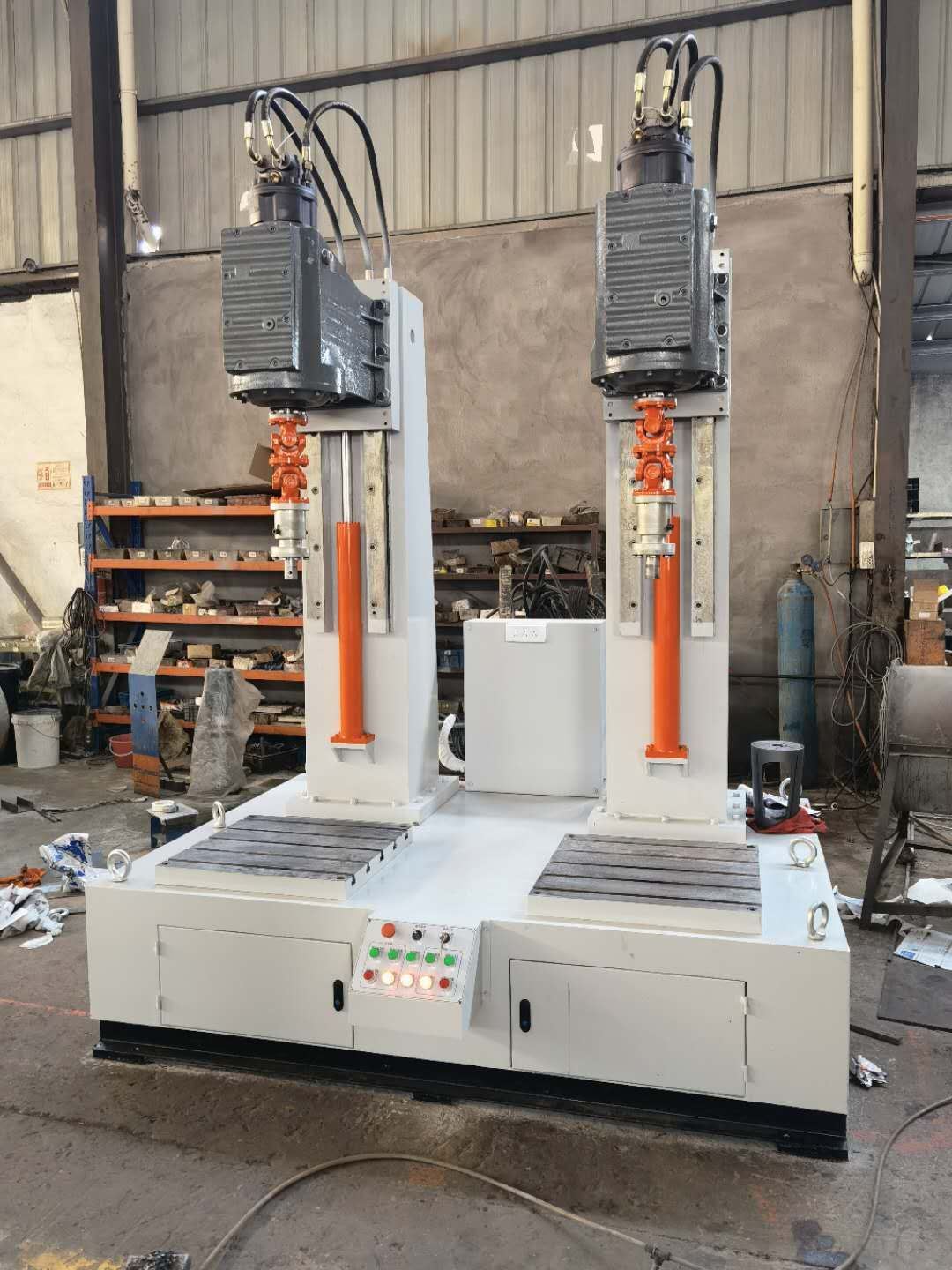 JLX型旋塞阀研磨机由立柱机架、导轨及升降机构、齿轮箱旋转机构、装夹机构等组成,旋转机构的旋转中心线相互垂直。立柱与齿轮箱底板的升降功能通过液压油缸来实现,通过按钮可进行上升或下降。